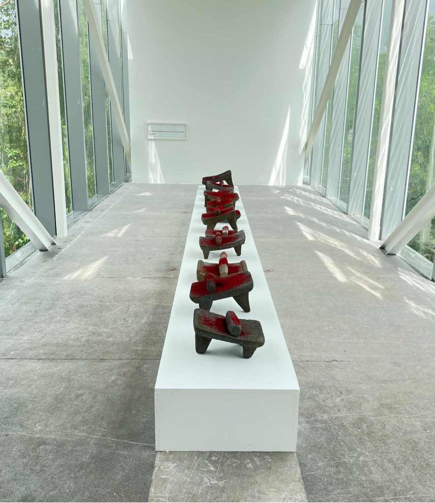 Dos instalaciones más forman parte de la muestra: Trompetas de madera (2014) y La molienda (2015-2022), La primera de ellas está compuesta por una serie de trompetas cuya forma diferente implica su variación acústica, en el interior de ellas los altavoces reproducen la caída del agua de un manantial. En la segunda instalación nos sorprende la presencia de tradicionales metates de piedra donde se muele la grana cochinilla para pigmentar y dar color al mundo que pervive y mantiene vigentes las culturas mesoamericanas. La tarjeta informativa acude en nuestra ayuda: “La presencia del pigmento en esta pieza evoca al intercambio comercial que se hacía con éste en la época colonial, a la explotación del territorio y a la fuerza política que representa el rescate de esta materia prima”.