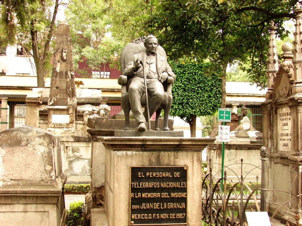 A diferencia de otros panteones de la ciudad de México, en el de San Fernando no se encuentran cruces, ni vírgenes devotas, ni ángeles dolientes, ni rostros de santos. Lo que si encontramos son esculturas como la de Juan de la Granja quien introdujo e impulso el uso del telégrafo en México en 1850.