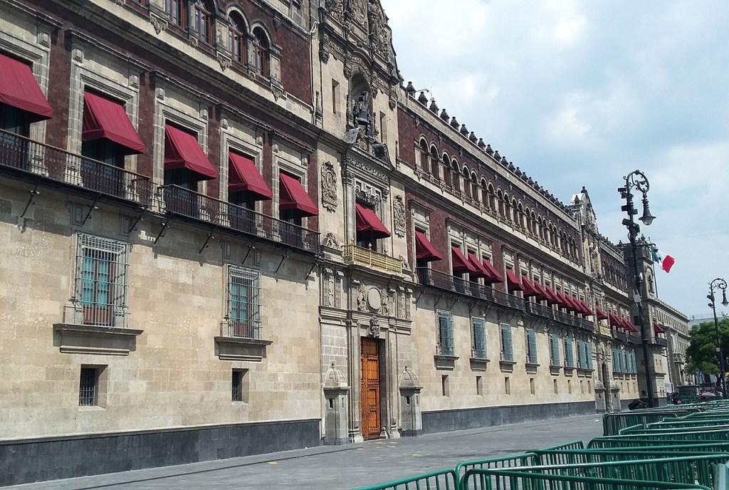 El Palacio Nacional en el Zócalo es el centro del poder en México, desde Moctezuma hasta nuestros días en que es sede oficial del poder ejecutivo. Fue construido en 1522 como residencia para Hernán Cortés, de estilo austero por fuera, es una fortaleza colonial con torres y troneras para defenderse.