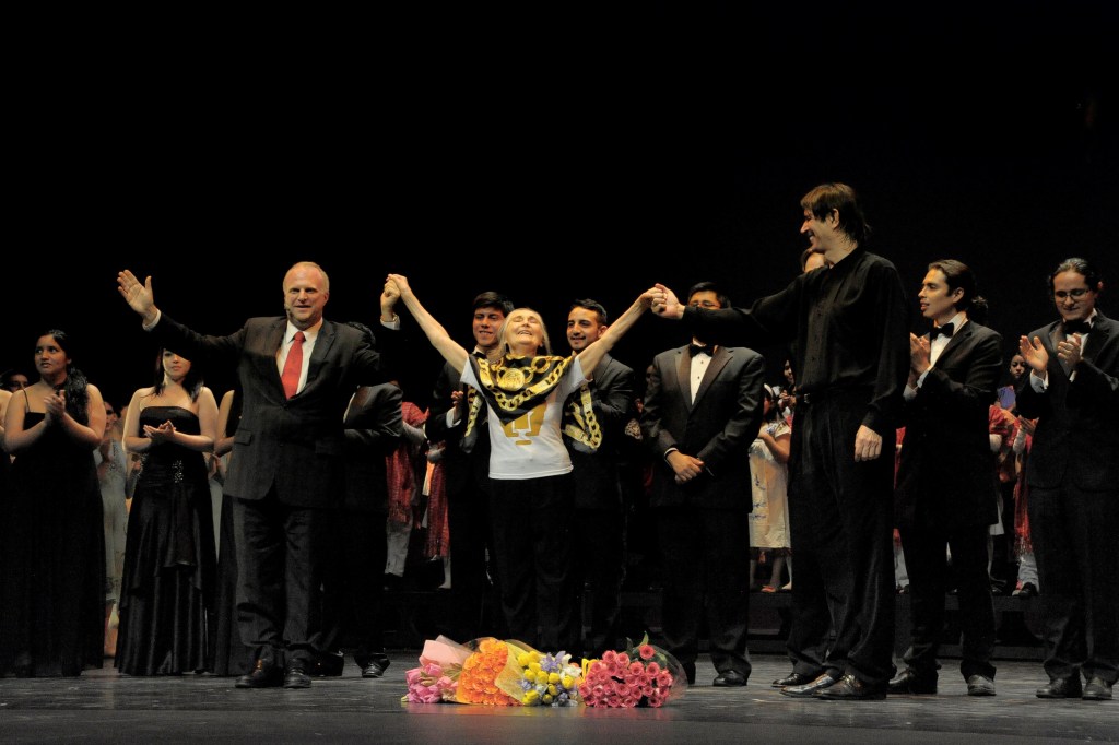 Fue un espectáculo emociónate que culmino con una gran ovación para la “Maestra”, que subió al escenario en medio de los aplausos del público y una vez ahí, hizo a un lado las pashmina que cubría su pecho para dejar al descubierto la playera con el puma, símbolo de la UNAM, provocando el estallido del goya universitario.